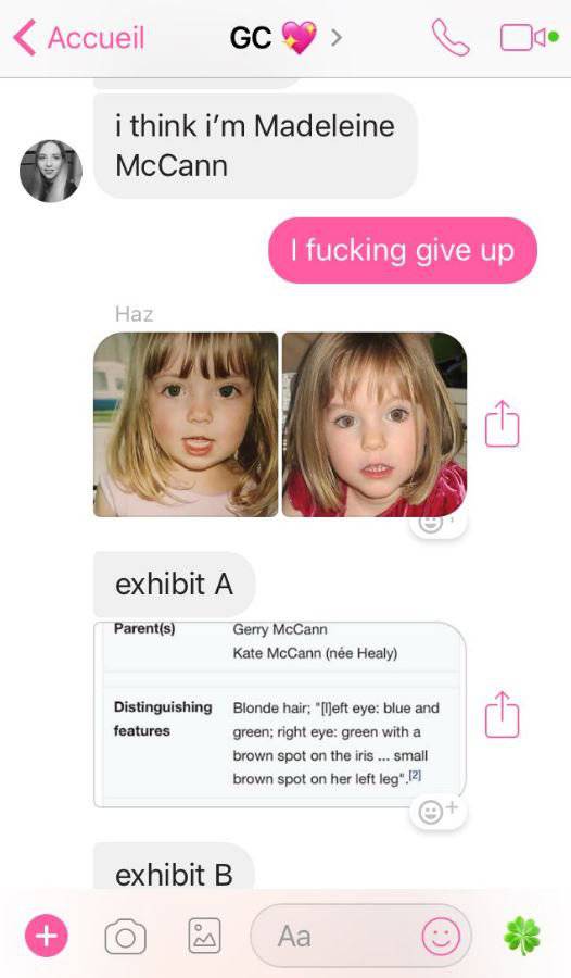 Harriet ha informato alcuni amici di questa sua tesi: lei si è detta convinta di tutto questo, e tra le immagini autoprodotte ce n’è una che riporta un segno marrone di piccole dimensioni all’interno dell’iride degli occhi, una caratteristica fisica che anche Maddie McCann possedeva. Allo stesso modo, ci sarebbe pure un neo sulla gamba che Harriet e la bimba condividerebbero nella stessa posizione. La studentessa ha scritto in una chat agli amici “Penso di essere io Madeleine McCann, non so più cosa fare di me stessa”. Una tesi rivolta però con scetticismo dai suoi conoscenti e che in poco tempo è diventata virale. Ed a smontare tutto arriva un particolare non da poco, rappresentato dall’età di Harriet: se fosse davvero lei Maddie, oggi dovrebbe avere quasi 14 anni mentre invece è più grande. Infatti frequenterebbe già l’università. Difatti poi la Brookes ha svelato che tutto era frutto solamente di uno scherzo.