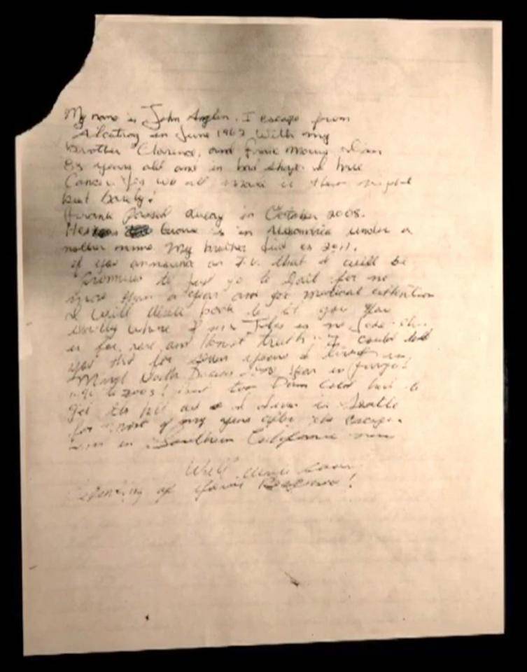 Inviata a un dipartimento di polizia di San Francisco nel 2013, ma resa pubblica questa settimana, la missiva prosegue, come riportato da Il Corriere della Sera: “Sono fuggito da Alcatraz nel giugno 1962 con mio fratello Clarence e Frank Morris. Ho 83 anni e sono in cattive condizioni, ho il cancro… Sì, ce l’abbiamo fatta tutti quella la notte, ma siamo stati fortunati”. Il presunto John Anglin sostiene che Frank “è morto” nel 2008 e suo fratello John è morto tre anni dopo. Ha quindi intenzione di raggiungere un accordo sorprendente con l’FBI, scrivendo: “Questo non è uno scherzo. Se annunciate in TV che mi verrà promesso di andare in prigione per non più di un anno e ricevere assistenza medica, vi scriverò per farvi sapere esattamente dove sono”.