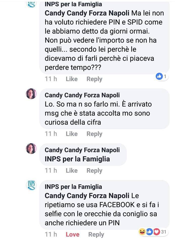 L’utente “Candy Candy Forza Napoli”, a sua volta, è sparita da Facebok e del suo profilo non c’è più traccia. Sarà cominciata anche per lei, un po’ come accadde per Giulia Pacilli, una sorta di gogna mediatica e la donna, probabilmente, non avrà retto alla popolarità, in questo caso non voluta. Le sue domande su come ottenere il PIN e lo SPID per accedere al pannello del Reddito di Cittadinanza, uniti al suo profilo dove si mostra con foto ironiche, sono diventate bersaglio perfetto sia della social media manager che degli altri utenti. C’è chi però ha voluto mostrare sinceramente vicinanza alla signora che, anche se un po’ imbranata, non meritava ad ogni caso risposte offensive sul suo privato. Tutti infatti, come accaduto alla signora Candy Candy, hanno diritto ad accedere al welfare, e non possono rischiare di diventare zimbello dei social, specie su pagine pubbliche o di informazioni al pubblico. “Una pagina come l’INPS”, fanno notare, “non può rivolgersi in modo così sgarbato, sia l’utente sveglia, meno sveglia, imbranata o meno imbranata”.
